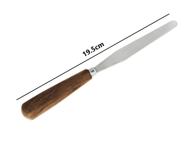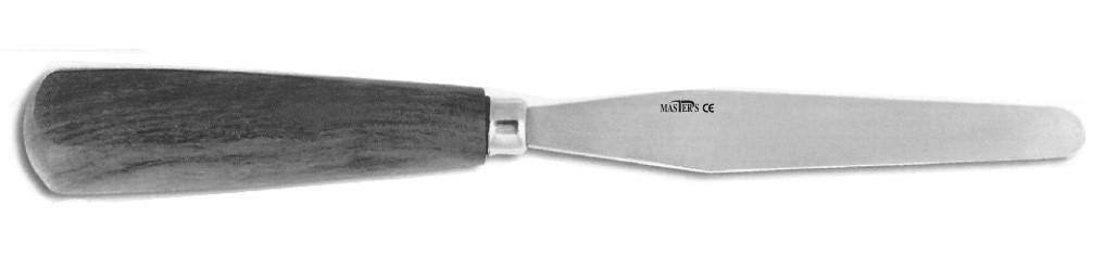 La espátula consta de una hoja lisa de forma romboidal grande y redondeada en el extremo casi sin filo, sujeta a un mango de madera, utilizada principalmente para siliconas en consultas dentales.