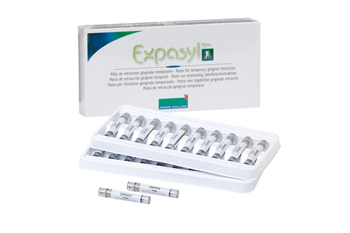 Sistema de retracción gingival atraumático, rápido y práctico.Sin anestesia, 2,5 minutos. Dispensado con pistola. Expasyl es un sistema de retracción gingival innovador y atraumático. Expasyl le ofrece la seguridad de obtener un acceso a los límites cervicales anatómicos reales, sea cual sea el tratamiento a realizar. Tras la retracción con Espasyl, obtendrá un campo clínico limpio e ideal para realizar una toma de impresión perfecta. Expasyl reemplaza las técnicas tradicionales, a menudo traumáticas, aportando las siguientes ventajas:1. Separa la encía marginal del diente sin dañar la ligadura del epitelio, eliminando los riesgos de recesión gingival y de reabsorción ósea. 2. Permite obtener un campo clínico exento de cualquier desangramiento o supuración. 3. El sistema de apertura de los surcos es fiable, rápido y práctico. 4. Garantiza una retracción regular y reversible de la encía, sin traumatizar los tejidos y sin la necesidad de utilizar anestesia. 5. Aplicación sencilla y rápida para el facultativo e indolora para el paciente. El tiempo de trabajo total no excede de dos minutos y medio para una apertura surcular de calidad. 6. Pasta de alta viscosidad con propiedades astringentes y hemostáticas. 7. Dispensado del material con pistola.