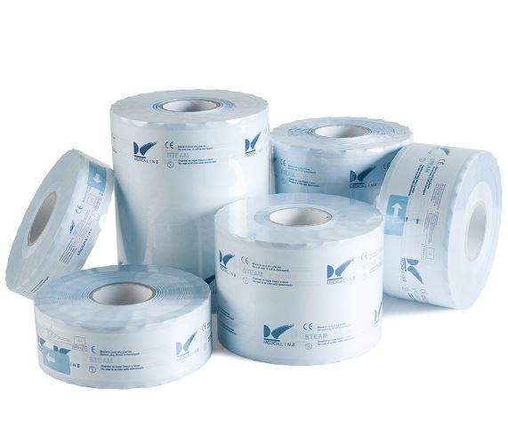 Rollos para esterilización de gran resistencia, aptos para autoclaves de vapor o químicos. Compuestos por una cara de papel y otra de plástico para la visualización del contenido.